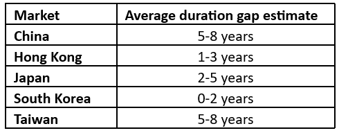 - The duration gap between Asian life insurers’ assets and liabilities is a critical issue that needs addressing given the higher capital charges resulting from new risk-based capital (RBC) regimes across Asia, potentially higher volatility arising from the new accounting rules in IFRS 9 and 17 and the practical challenge of a lack of long-duration instruments in local fixed income markets.