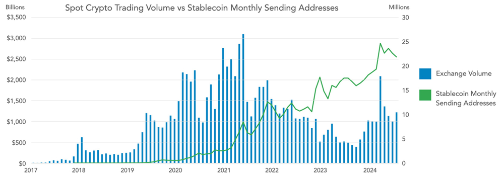 By combining the price stability of traditional fiat currencies with the efficiency of blockchain, transaction volumes have steadily increased, reflecting stablecoins’ growing use in everyday economic activities.