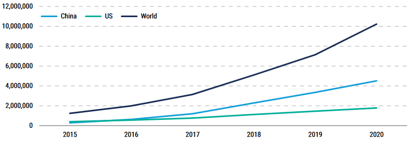 China, while still the largest carbon emitter in the world[7], also has the world’s largest battery-electric vehicle market and is projected to see the sharpest growth in the years ahead, after the key turning point relative to the rival US market in 2014 and 2015.