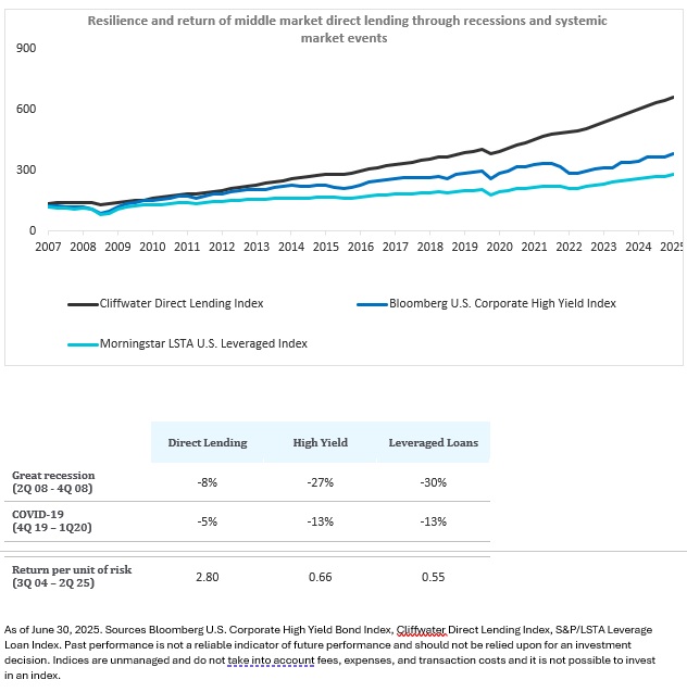 Inevitably, there are some structural risks, such as periods of illiquidity. Yet credit discipline enables direct lending to enhance portfolio yield, provide downside protection and serve as a stable, income-oriented allocation through changing market environments. Historically, middle market direct lending has weathered uncertain market and economic conditions much better than the broadly syndicated loan market and public corporate high yield, delivering a higher return while experiencing significantly less draw down and a lower default rate.